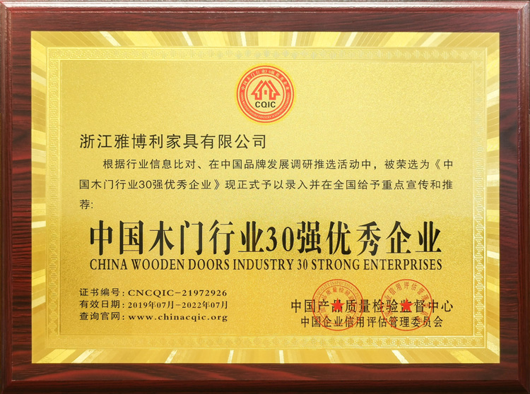 獲 < 中國木門行業(yè)30強優(yōu)秀企業(yè) >